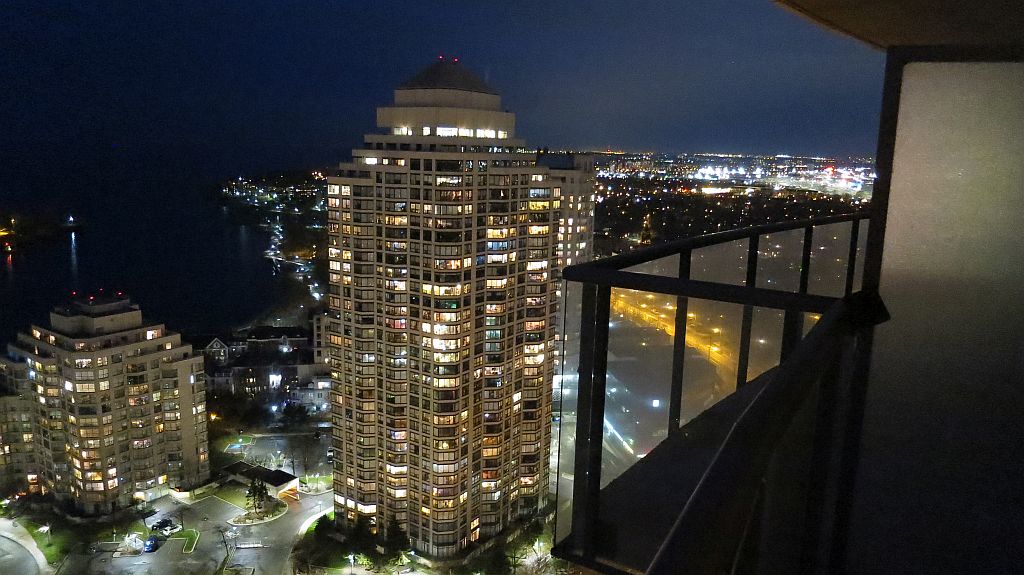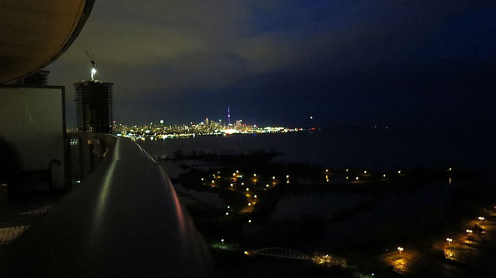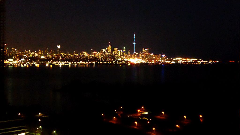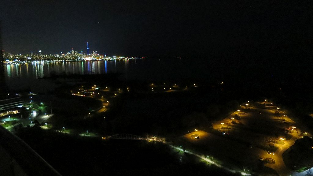 Die Suche nach der Autovermietung entpuppte sich als nächses Problem, das nur am Infostand zu lösen war. Ohne wirklich sichtbare Hinweise mußte man dann mit allen Koffern durch eine Nebentür aus dem Flughafengebäude raus und über die Strasse, wo irgendwo unten an einem Parkhaus eine kleine schäbige Hütte stand, in der ein einziger Mitarbeiter stand, der die Schlange bediente. Als ich nach einer weiteren halben Stunde endlich dran war, hatte ich hier wenigstens das zweifelhafte Glück, schon aufgrund des Vorjahresaufenthaltes in New York im Alamo System erfasst zu sein, was die Prozedur erheblich verkürzte bzw. auf das Ablehnen der ganzen Zusatzfeatures beschränkte, mit der jeder Urlauber über den Tisch gezogen werden soll. Dank unseres mitgebrachten Navis waren wir deshalb in weniger als einer halben Stunde am Zielort, trotzdem zweieinhalb Stunden nach unserer Ankuft, wo es mittlerweile dunkel wurde und sich im 30. Stock ein herrlicher Ausblick auf die Nachbarschaft und die Skyline von Toronto bot.