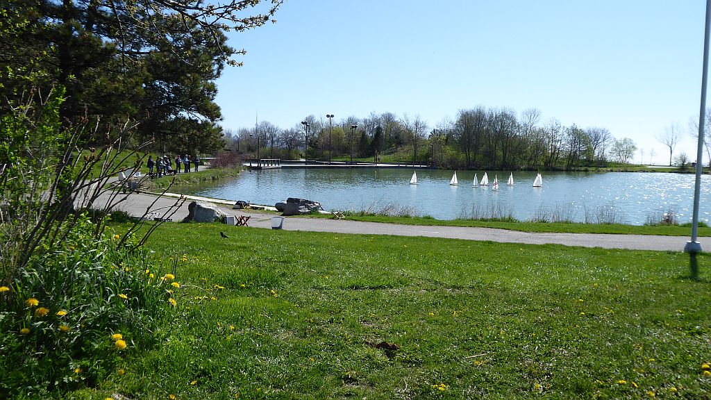 An einem der Teiche steht eine ganze Gruppe von Leuten, die ihre ferngesteuerten Segelboote schwimmen lassen…
