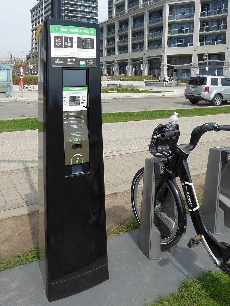 Heute ist bestes Wetter angesagt und wir gehen zur nächstgelegenen Fahrrad-Mietstation, wo wir nur so eine kleine Plastikkarte in den Kassenautomat stecken müssen und schon zwei Farräder entnehmen dürfen.