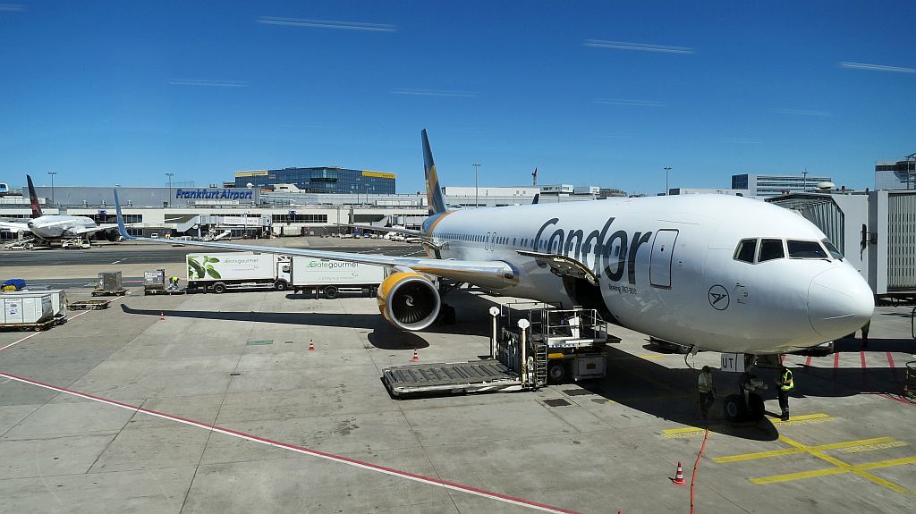 Da wir bis auf das Parkhausproblem relativ gut durchgekommen waren, hatten wir rund drei Stunden Zeitüberschuß vor Abflug, was sich noch als Glück erweisen sollte. Der erste Condor-Mitarbeiter am Check In las zwar aufmerksam unsere Unterlagen und suchte uns auch im System, um uns aber dann mitzuteilen, daß er alle Reisende abfertigen könne, bis auf die, die nach Kanada oder die USA wollten, die müßten ‚da hinten um die Ecke‘ an den Schalter…