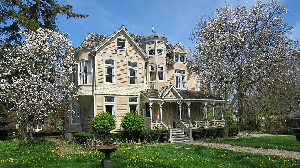 Die Fahrt beginnt morgens um 08:30 am vereinbarten Treffpunkt in der Stadt, von da aus geht es etwa eine Stunde bis zum Touristenörtchen Niagara On The Lake, wo es außer Andenkenläden auch noch ein paar schöne alte Häuser gibt… und wo der Frühling gerade einzieht, der bei uns zu Hause schon vorbei ist.