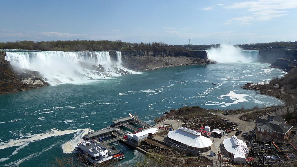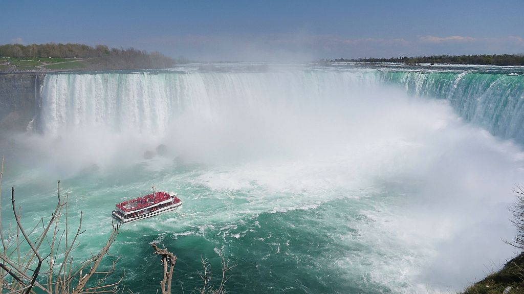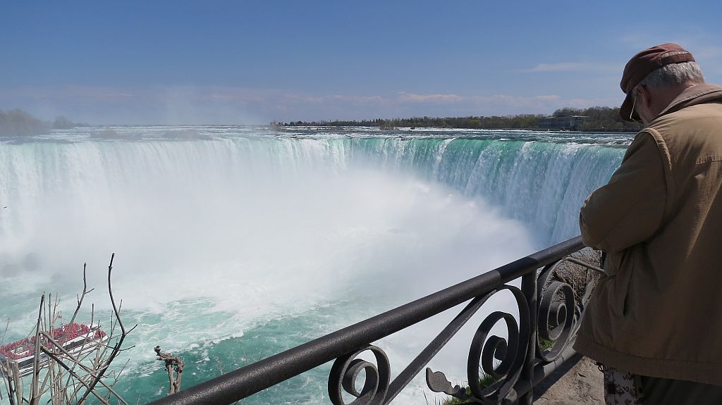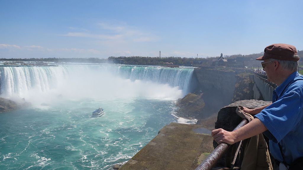 Mit ein paar kurzen Halts geht es dann zu den Fällen, die um diese Jahreszeit noch nicht ganz so stark frequentiert sind, aufgrund des außergewöhnlich schönen Wetters heute aber doch schon. Vorne sieht man die kleineren Fälle auf der amerikanischen Seite, im Hintergrund die mehr als dreimal so breiten Horseshoe Falls der kanadischen Seite.