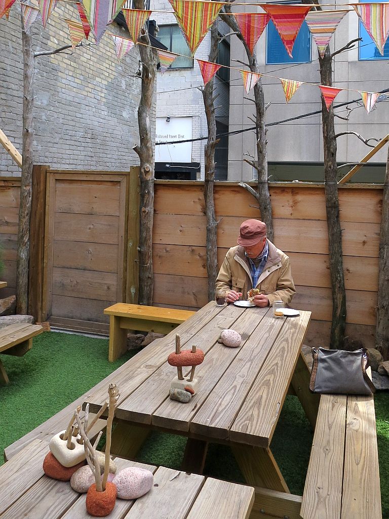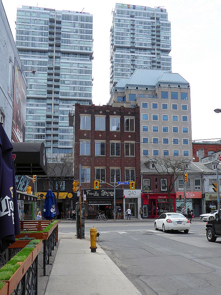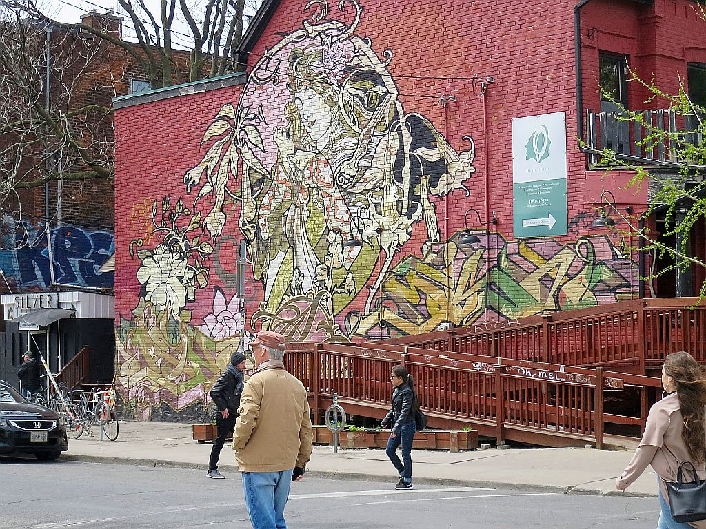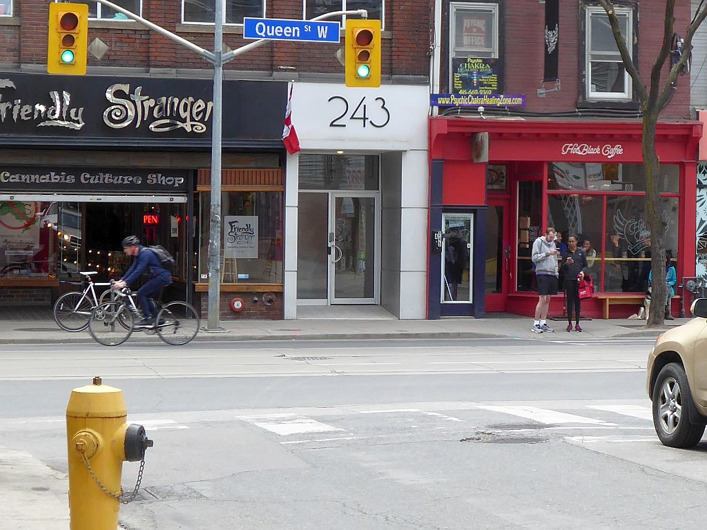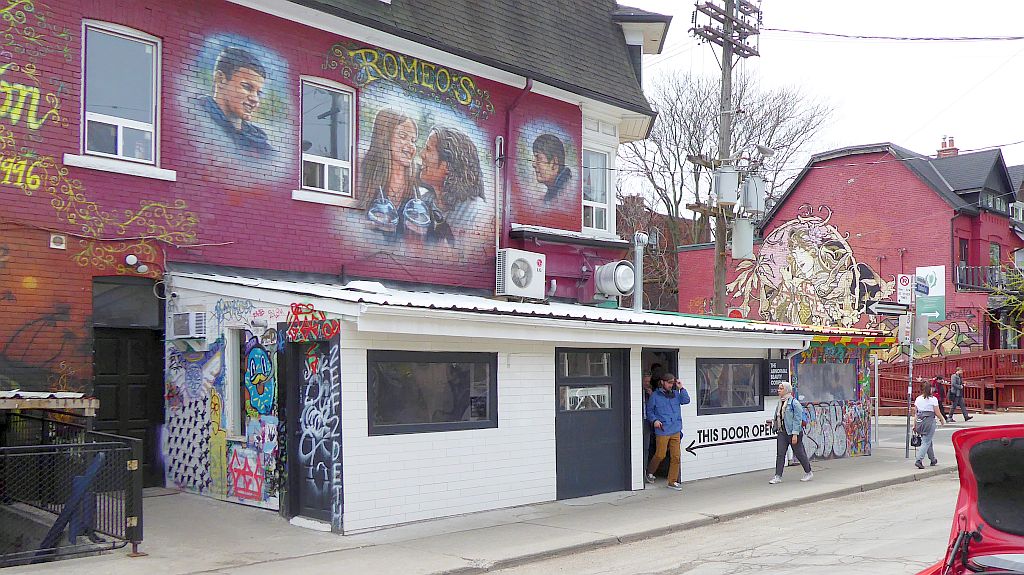 Nach fast einstündiger Straßenbahnfahrt sind wir an der Queen Street West, wo wir wieder in dem kleinen roten Café frühstücken, das man zwischen den Hochhäusern kaum findet.