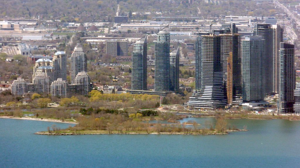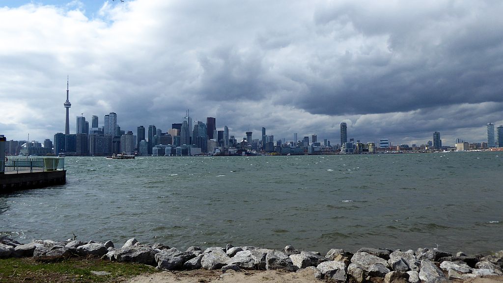 Am nächsten Morgen ließ sich der Nachtansicht des Vorabends auch die Tagesansicht gegenüberstellen. Jetzt löst sich auch das Rätsel der Autobahn im Nachtbild der Skyline: es ist das Geländer des Balkons, auf das ich die Kamera beim Nachtbild stellen mußte, um nicht zu verwackeln. Unten sieht man den Humber Bay Park, in dem wir heute mal etwas spazieren gehen wollen.