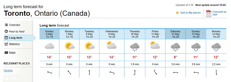 Während sich hier gerade ein stabiles Langzeithoch mit bis zu 30° breit macht, sind die Aussichten für Toronto nicht ganz so berauschend.