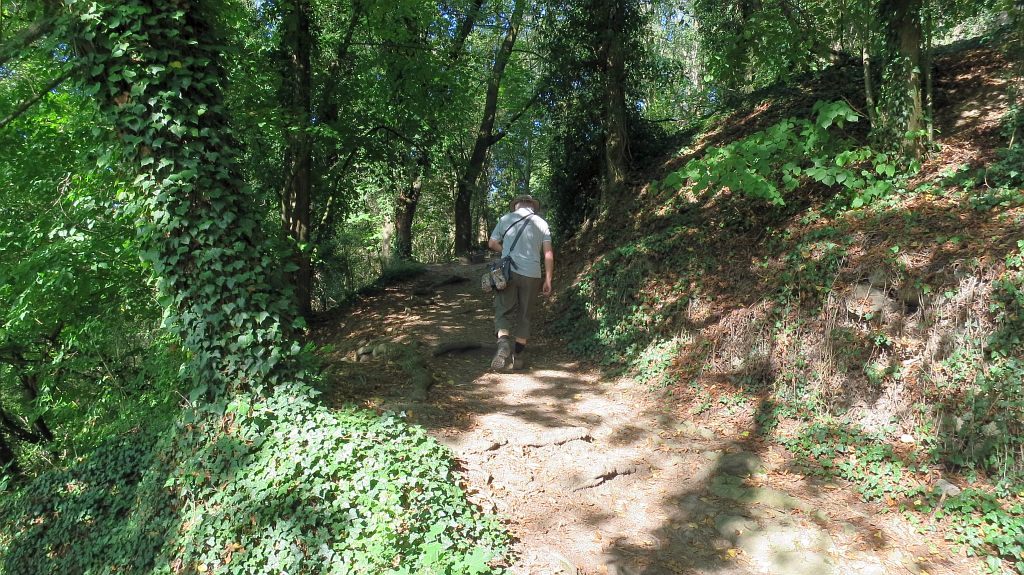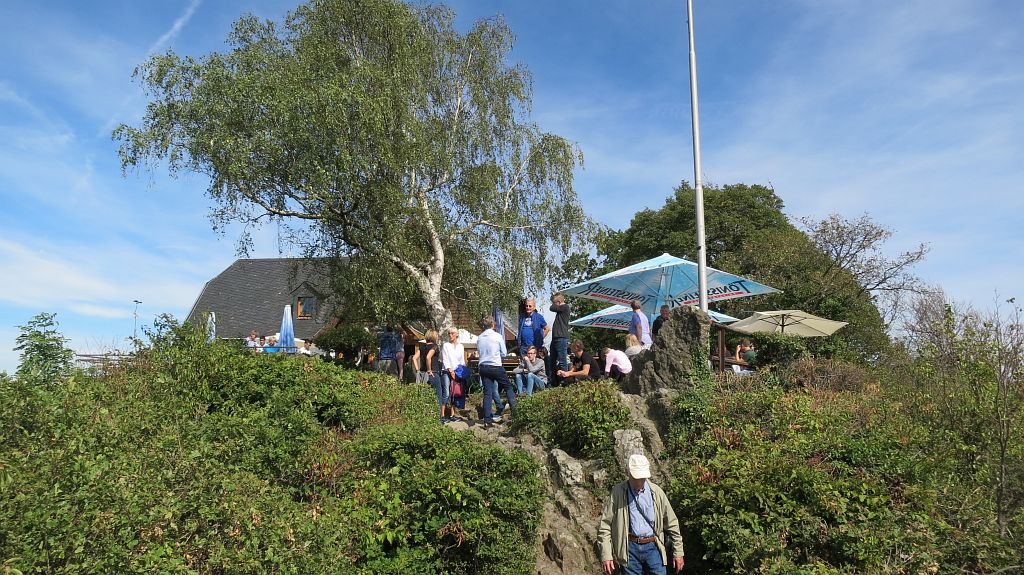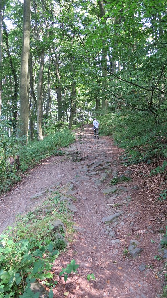 Wir nehmen in Godesberg die Fähre und fahren auf der anderen Rheinseite bis nach Rhöndorf, wo wir nach längerer Suche gerade noch den (ohnehin schon etwas abgelegenen) letzten Parkplatz bekommen, obwohl es noch keine 10:00 Uhr ist. Mitten in der bereits sehr belebten Fußgängerzone geht es über eine schmale Gasse zum Fußweg zum Drachenfels, der bald in einen Waldweg übergeht. Hier trifft man dann auch nur noch wenige bis keine Wanderer, die meisten fahren zum Glück lieber zum Drachenfels.