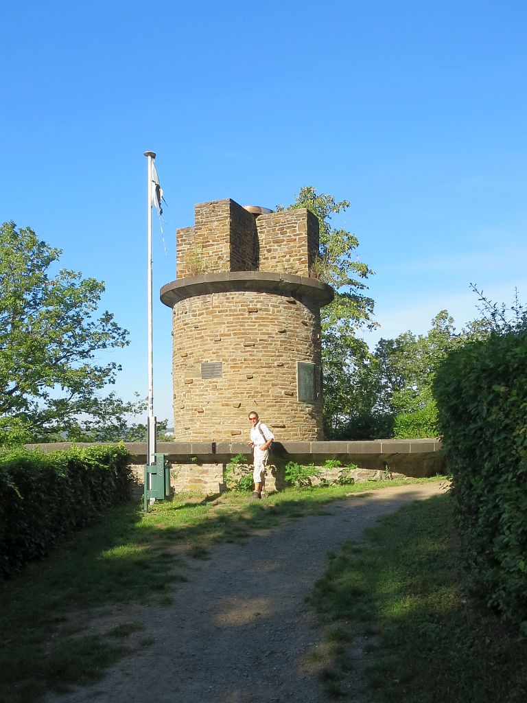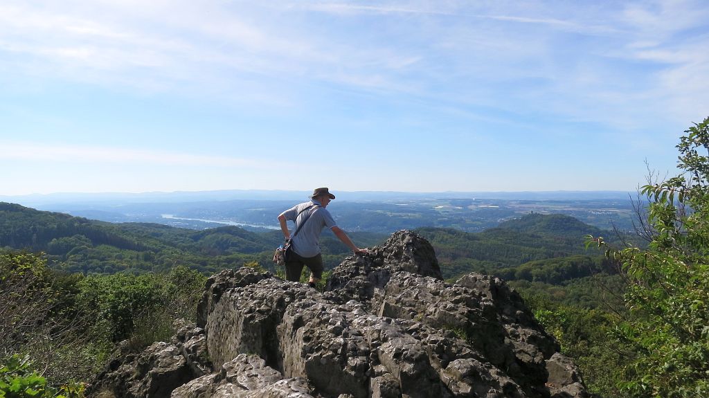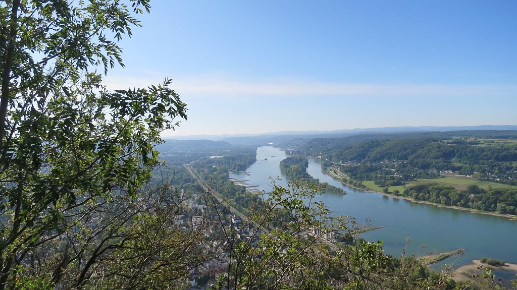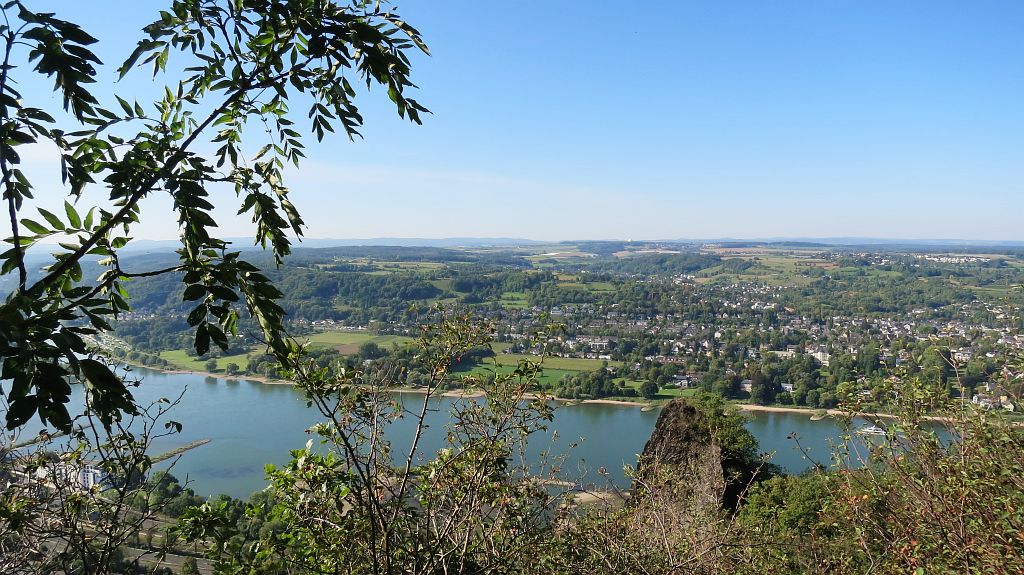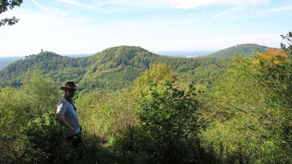 Jetzt sind alle Gipfel bezwungen und es geht langsam an den Abstieg. Ein letzter Blick auf den Drachenfels – diesmal zur Linken und von hinten – ganz rechts ist der Petersberg zu sehen, dazwischen hinter dem Schallenberg ein Stück Rhein mit dem Telekom-Hochhaus.