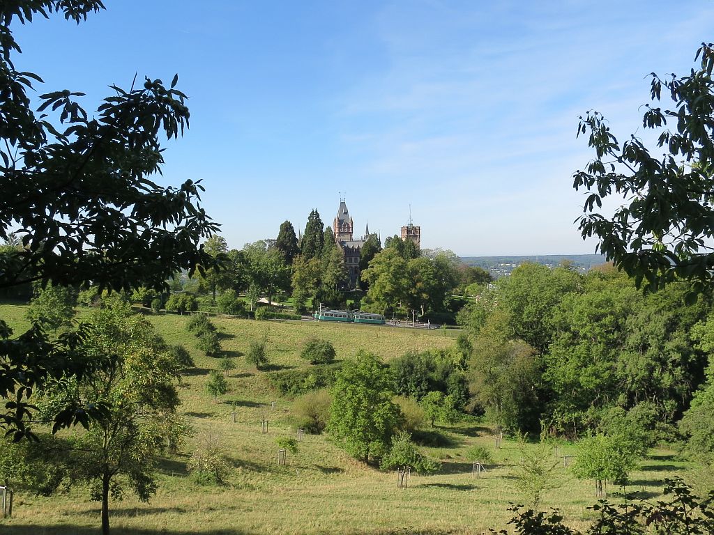 Da der Eselsweg gesperrt ist, müssen wir die geplante Route kurz verlassen und sehen die Drachenburg deshalb nur von weitem, während davor die Drachenfelsbahn die nächsten Sonntags-Ausflügler hochfährt.