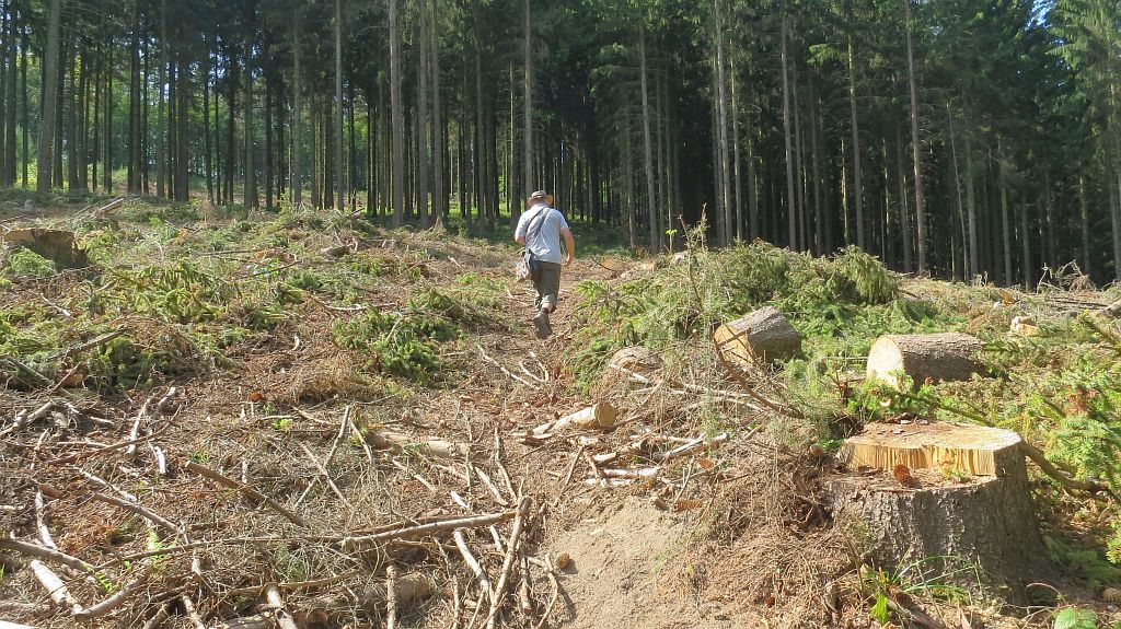 …und machen uns ziemlich schnell wieder auf den weiteren Weg. Wieder einmal erweist es sich als vorteilhaft, ein GPS Gerät dabeizuhaben, denn der ausgewiesene Weg endet plötzlich und wir müssen ein Stück querfeldein durch diverse Kahlschläge, die wohl dem heißen Sommer und dem Borkenkäfer geschuldet sind.