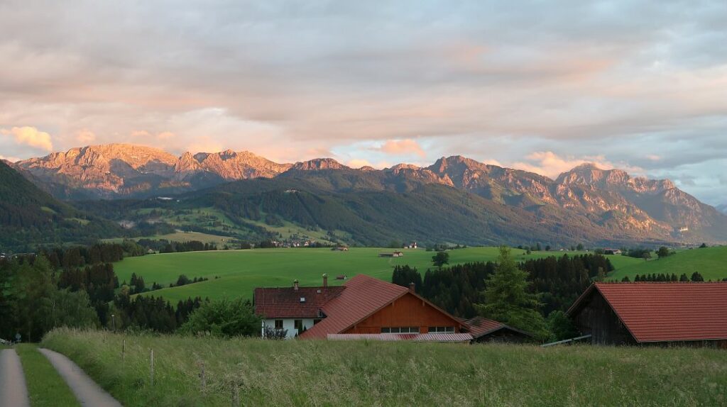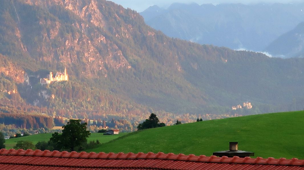 Ganz rechts am Bildrand kann man in der Ferne das Märchenschloß Neuschwanstein in der Abendsonne erahnen…