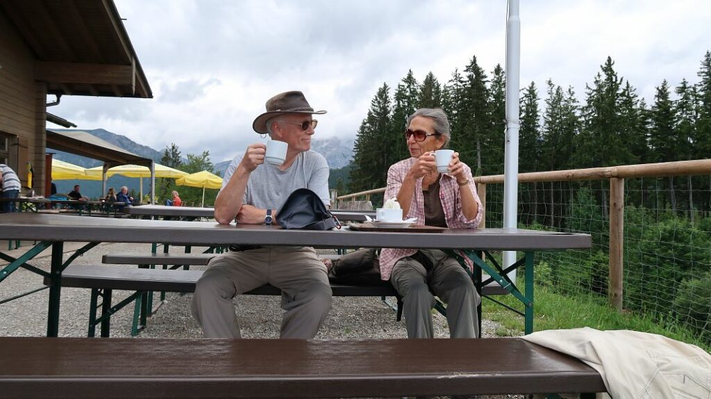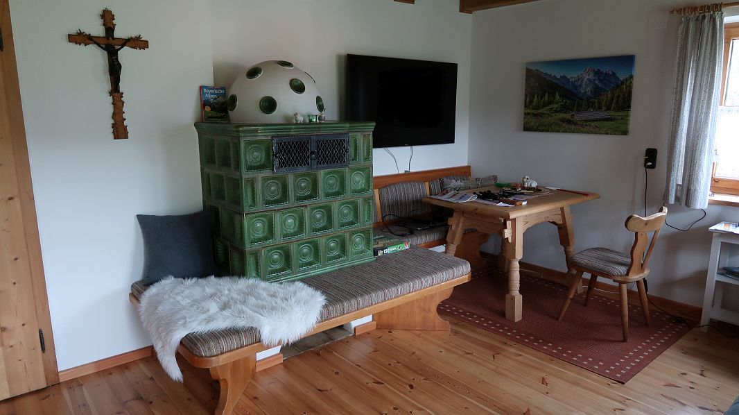 Heute ist Regen angesagt und wir lassen uns mit dem Frühstück Zeit, zumal uns die gestrige Erstwanderung noch in den Knochen steckt. Mit dem Regen ist es auch etwas kälter geworden, dafür gibt es aber in der Stube einen großen Kachelofen, der im Flur von der Rückseite aus mit Holz befeuert wird und sowohl Hüttenfeeling als auch Wohnklima anheizt.