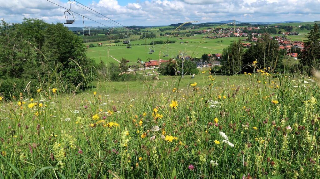 Der Regen ist vorbei – zumindest laut Wettervorhersage – und wir machen uns auf, um eine der Touren zu machen, die noch auf unserer Liste stehen. In Buching – nur wenige Kilometer von unserer Unterkunft entfernt – geht ein Sessellift zur Buchenbergalm hoch, man kann die Strecke aber auch zu Fuß angehen und gegebenenfalls dann nur mit dem Lift wieder runterfahren. Wir starten am Parkplatz an der Talstation,,,