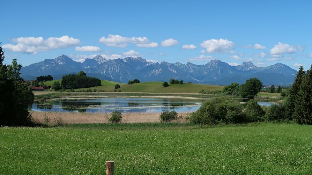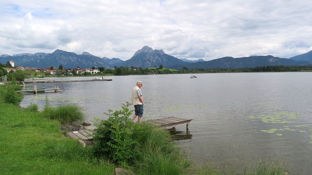 Unser Ziel ist der nahe gelegene Schapfensee, um den ein Wanderweg führt, der dann auch gleich praktischerweise an einer Gaststätte endet. Das Alpenpanorama hinter dem See ist mindestens so schön wie das am Hopfensee, allerdings ist es hier nicht so touristisch überlaufen.