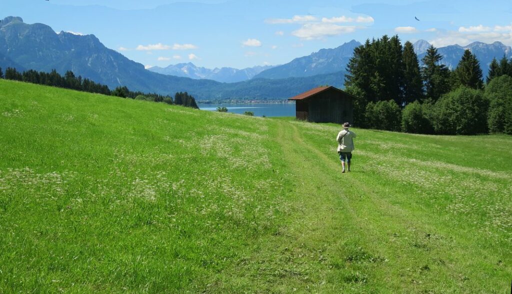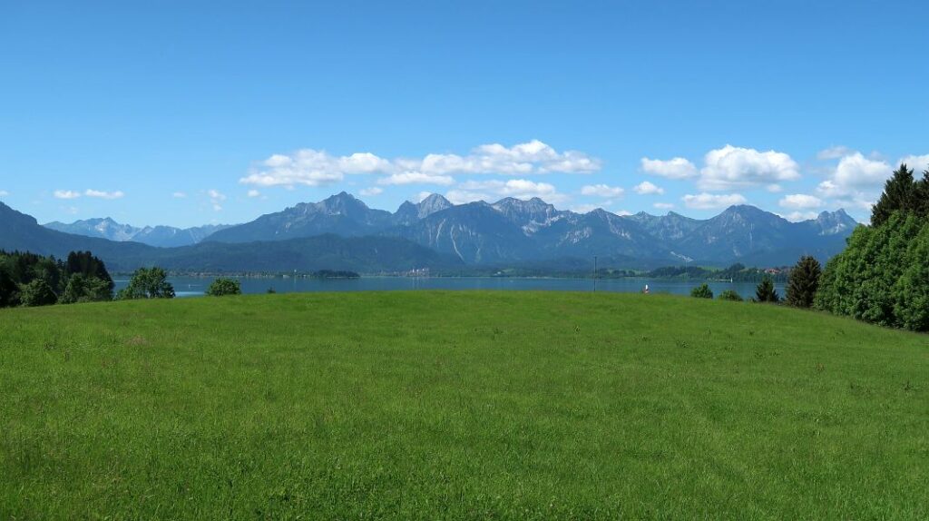 Bald tritt man aus dem Wald heraus und nähert sich dem durch den Lech gespeisten Forggensee…