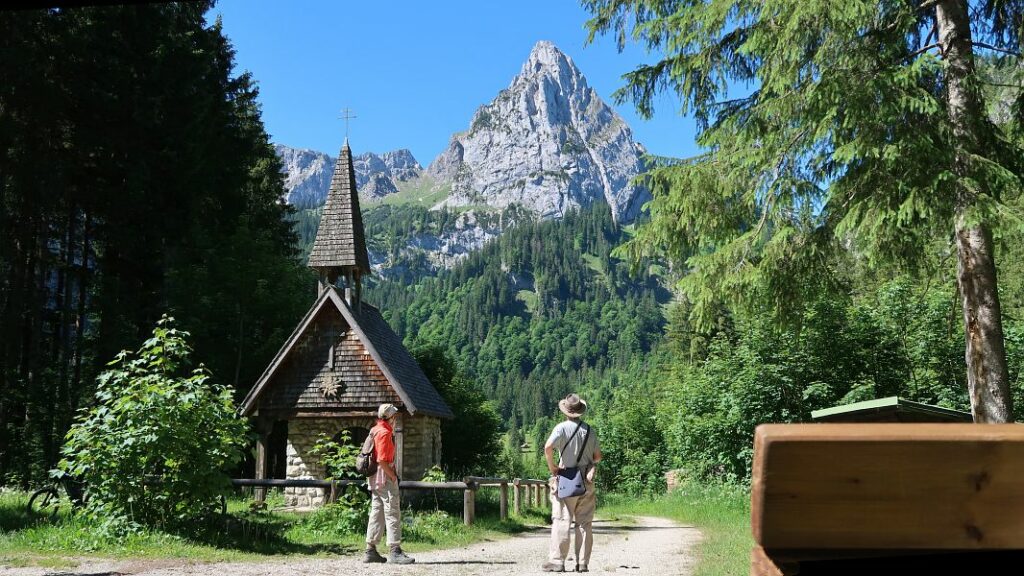 Laut Wettervorhersage soll heute der schönste Tag der Woche sein und wir machen uns schon gegen halb acht auf, um zur Kenzenhütte zu wandern. Vom Parkplatz aus geht es einige Zeit auf der Straße am Halblech vorbei, über den auch der Kleinbus fährt, mit dem man die Hütte in weniger als einer Stunde erreichen kann.