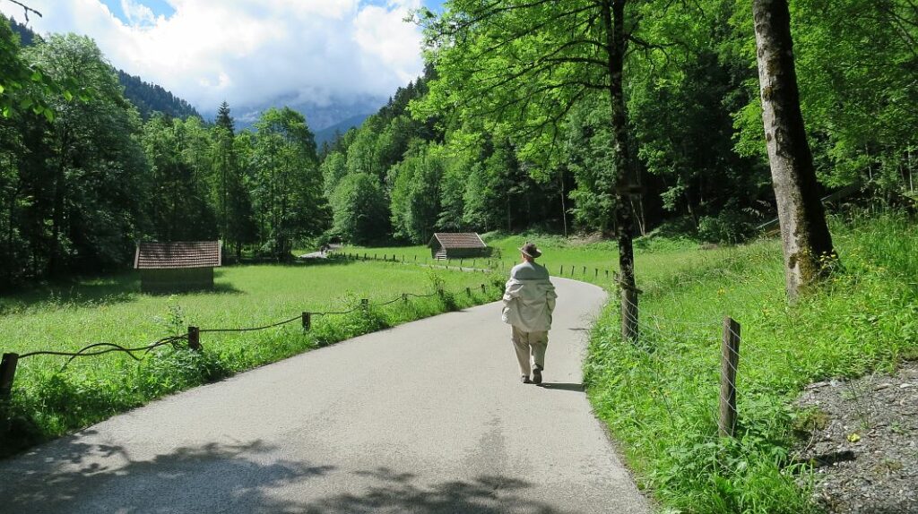 Schon der Weg zum Eingang der Partnachklamm ist schön gelegen und es wird bald unter der Regenbekleidung warm, die für die Klamm-Durchwanderung angeraten wird.